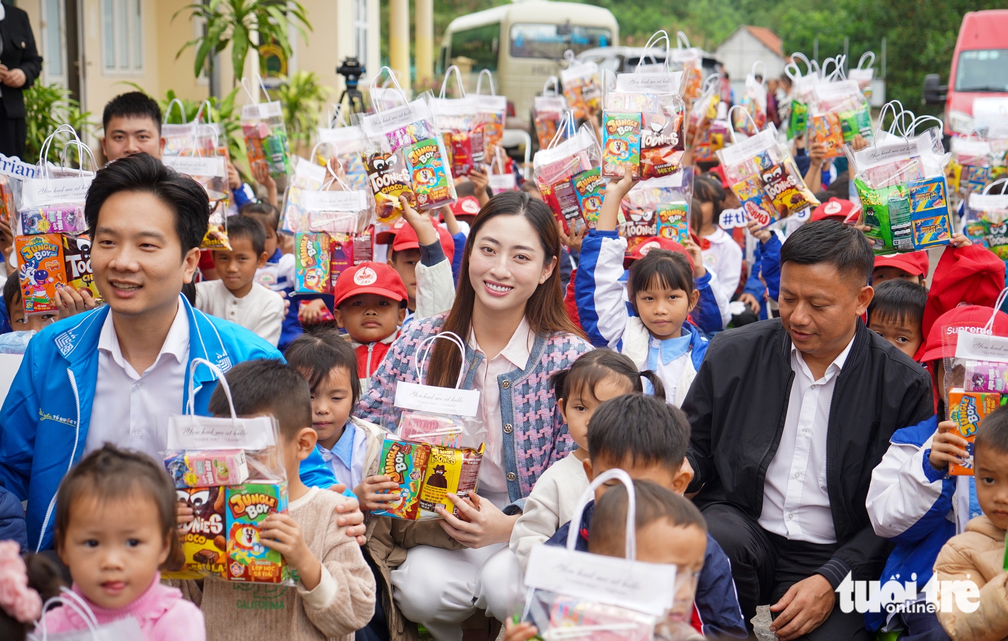 Lương Thùy Linh cùng tặng quà học sinh ở điểm trường Bảy Cửa, xã Đường Hoa, Quảng Ninh - Ảnh: VŨ TUẤN
