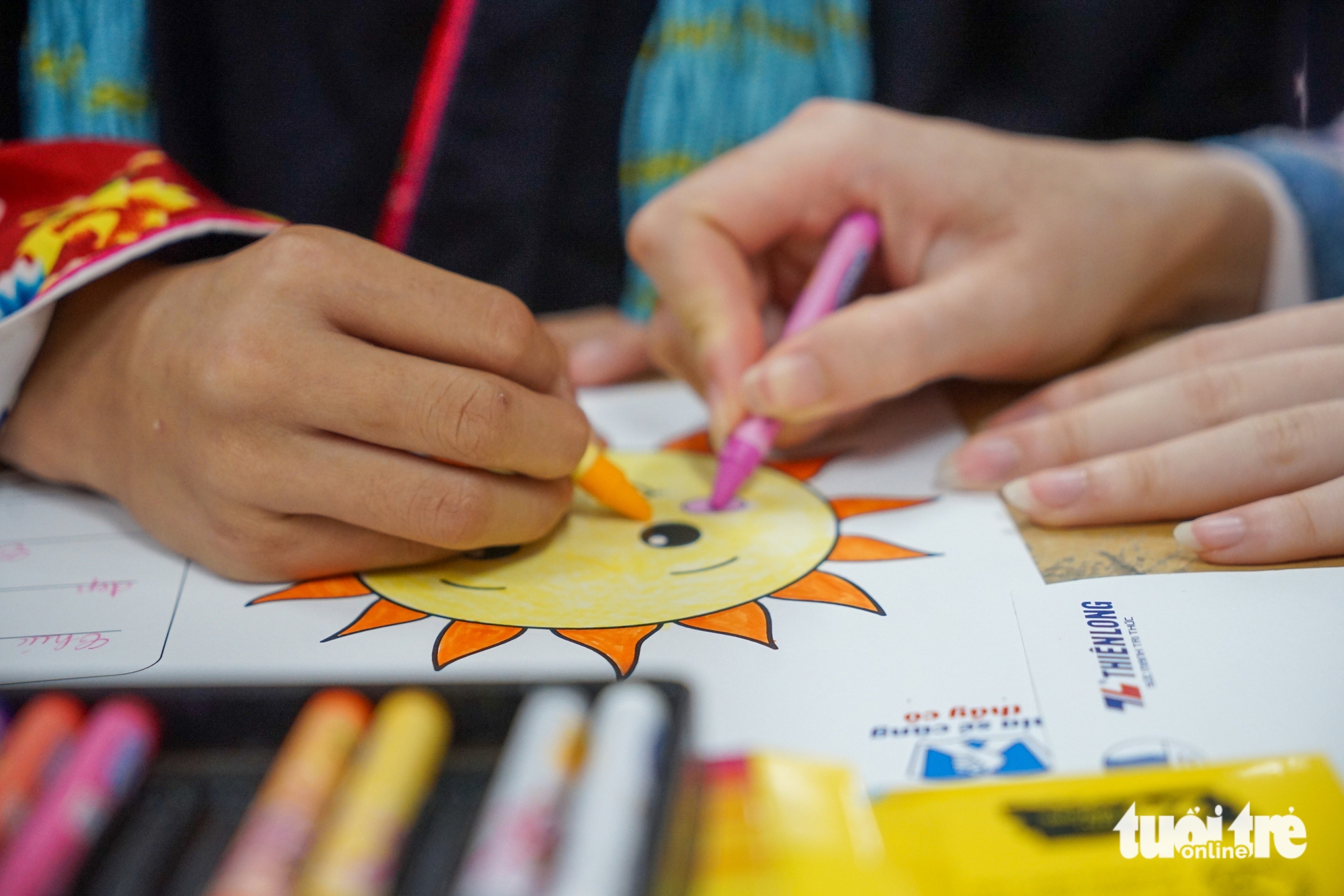 Hoa hậu Lương Thùy Linh cùng học sinh Trường tiểu học Đường Hoa lan tỏa thông điệp "Triệu trái tim Việt cùng viết vẽ lời tri ân" - Ảnh: VŨ TUẤN